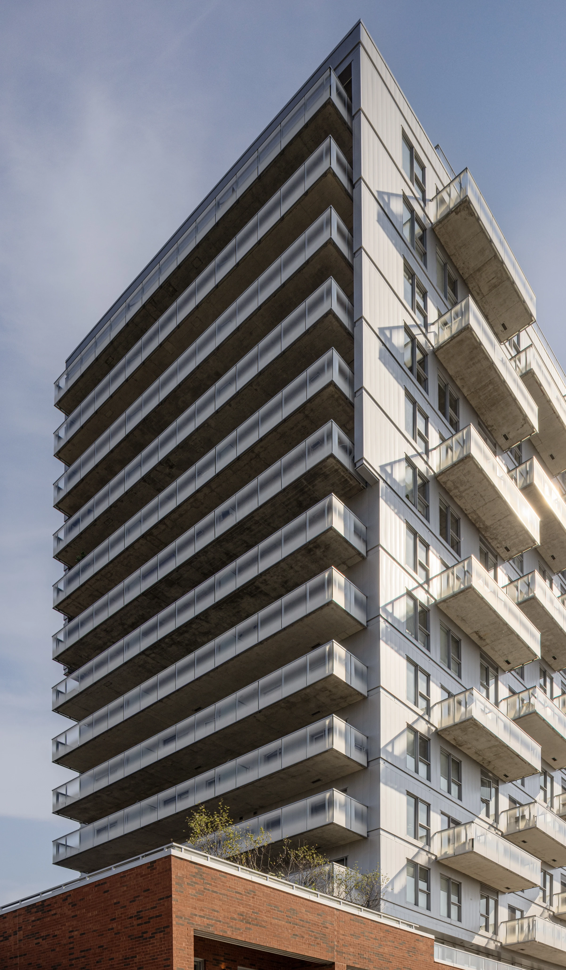 La série photographique a été conçue afin de rendre lisibles ces contrastes ainsi que la dynamique spatiale propre à la multihabitation. Les vues extérieures mettent en évidence la relation entre les surfaces, où la lumière accentue la profondeur de la maçonnerie et souligne la précision des lignes en aluminium. Les balcons décalés instaurent un rythme visuel marqué, générant une succession d’ombres et de reflets évoluant au fil de la journée. Les prises de vue en contre-plongée renforcent la verticalité du volume situé à l’angle de la rue, tandis que des cadrages plus rapprochés s’attardent aux détails architecturaux, aux loggias et à la texture des matériaux.
