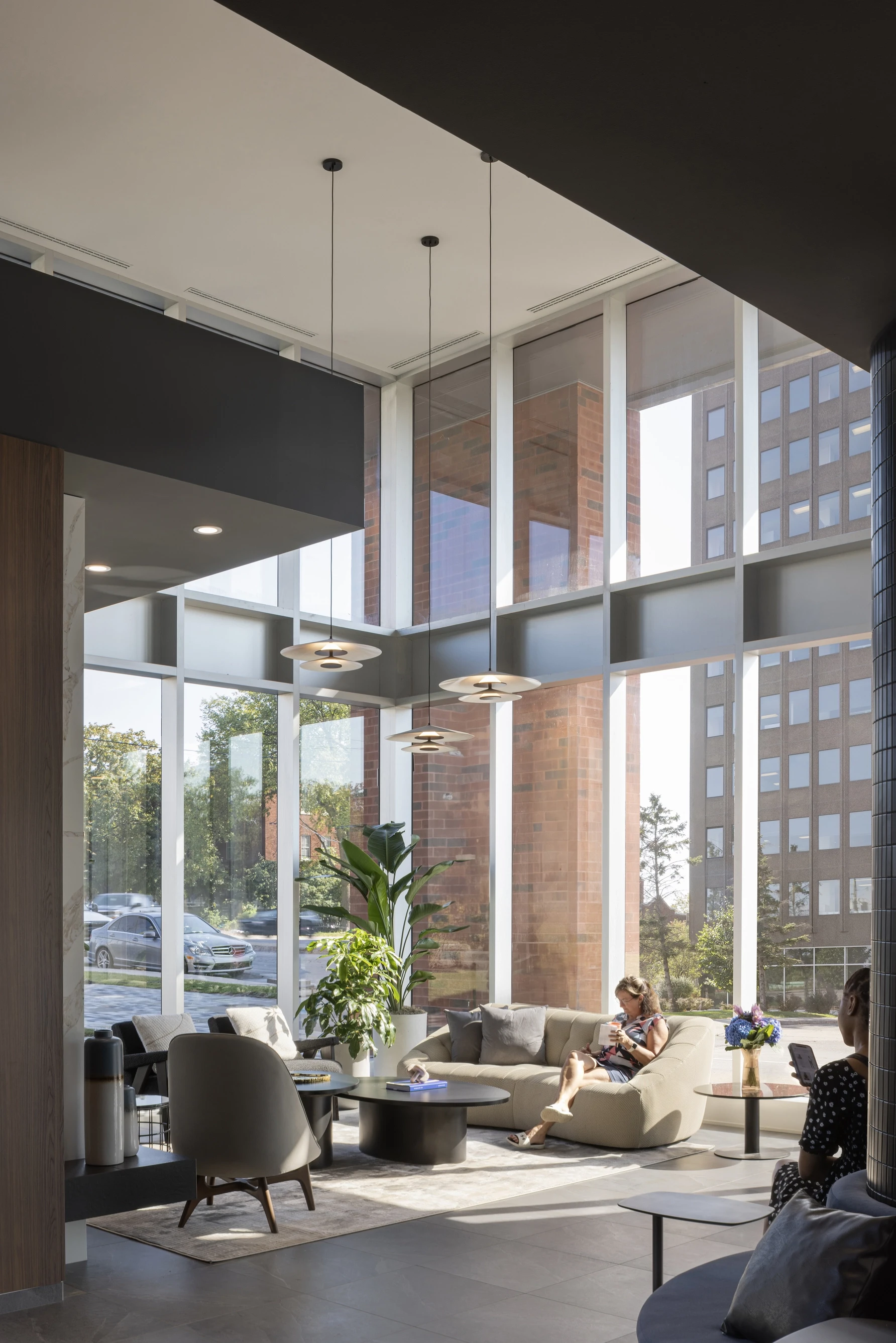 À l’intérieur, la photographie explore la relation entre transparence, structure et usage. Le hall vitré à double hauteur agit comme point d’ancrage visuel, illustrant la continuité entre les espaces communs et la rue. Les vues larges traduisent la fluidité des circulations, alors que des compositions plus serrées mettent en valeur la matérialité, les reflets et le comportement de la lumière naturelle sur les surfaces. Les vues aériennes complètent la lecture du projet en situant l’architecture dans son contexte urbain et en soulignant la cohabitation entre bâti existant et nouvelles interventions.