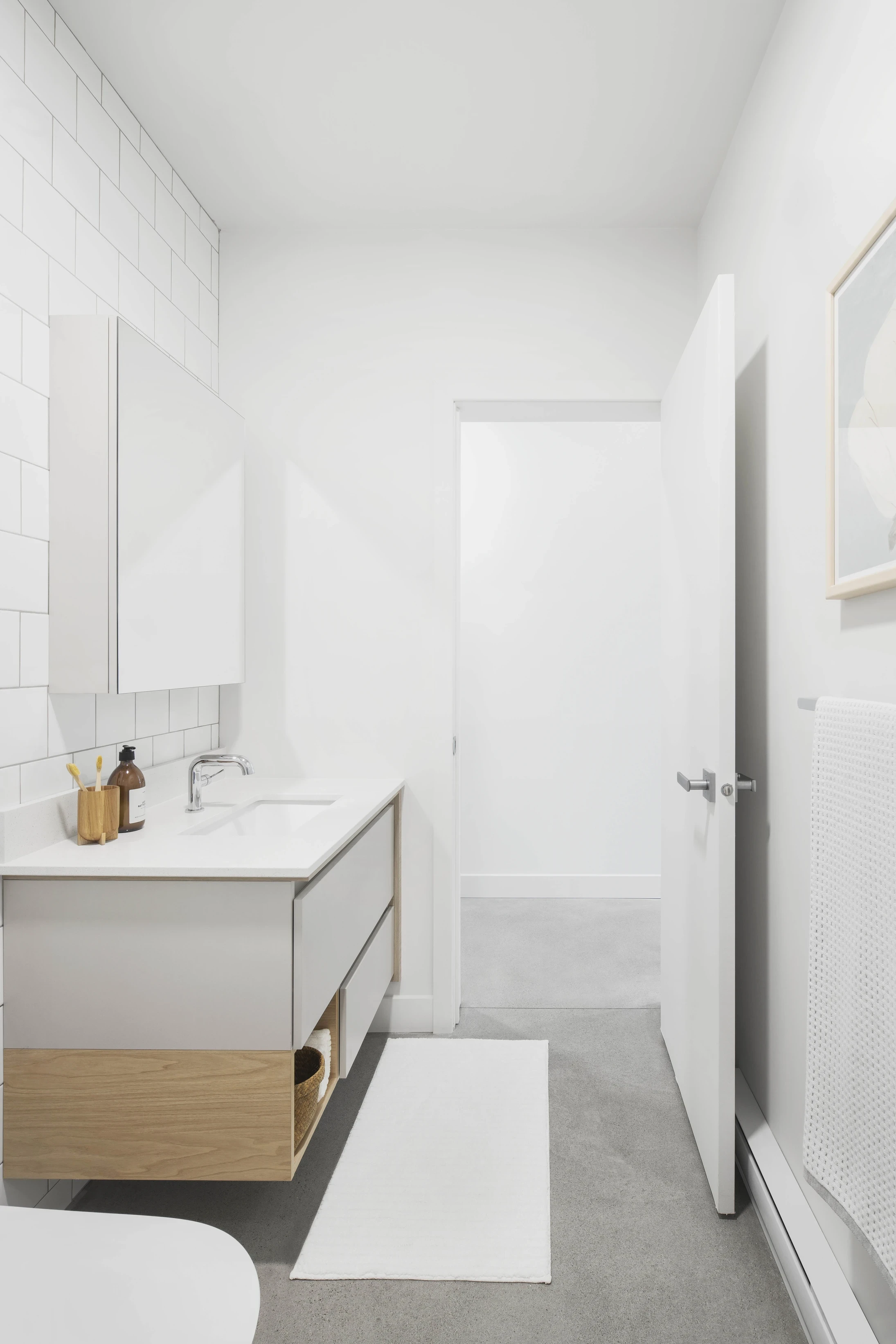 The design process began with a careful study of site conditions. Dense woodland encloses the western edge, while open meadows stretch toward the east. In response, the building adopts a long, narrow footprint aligned east to west — allowing for optimal daylighting and soft transitions between interior zones. Spaces are organized sequentially: the north-facing studio receives cool, even light ideal for painting, while the south-facing living space opens to a wooden terrace that catches afternoon sun and extends the interior into the surrounding field. Daily life follows the movement of light — from the quiet east-facing bedroom at sunrise to the golden shadows cast across the workspace at dusk.